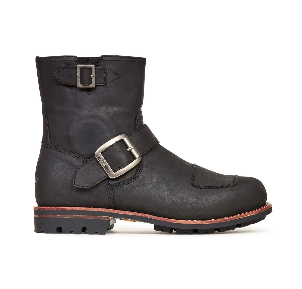 ・ブランドバックル、エンボスロゴ、オールブラックのステッチ